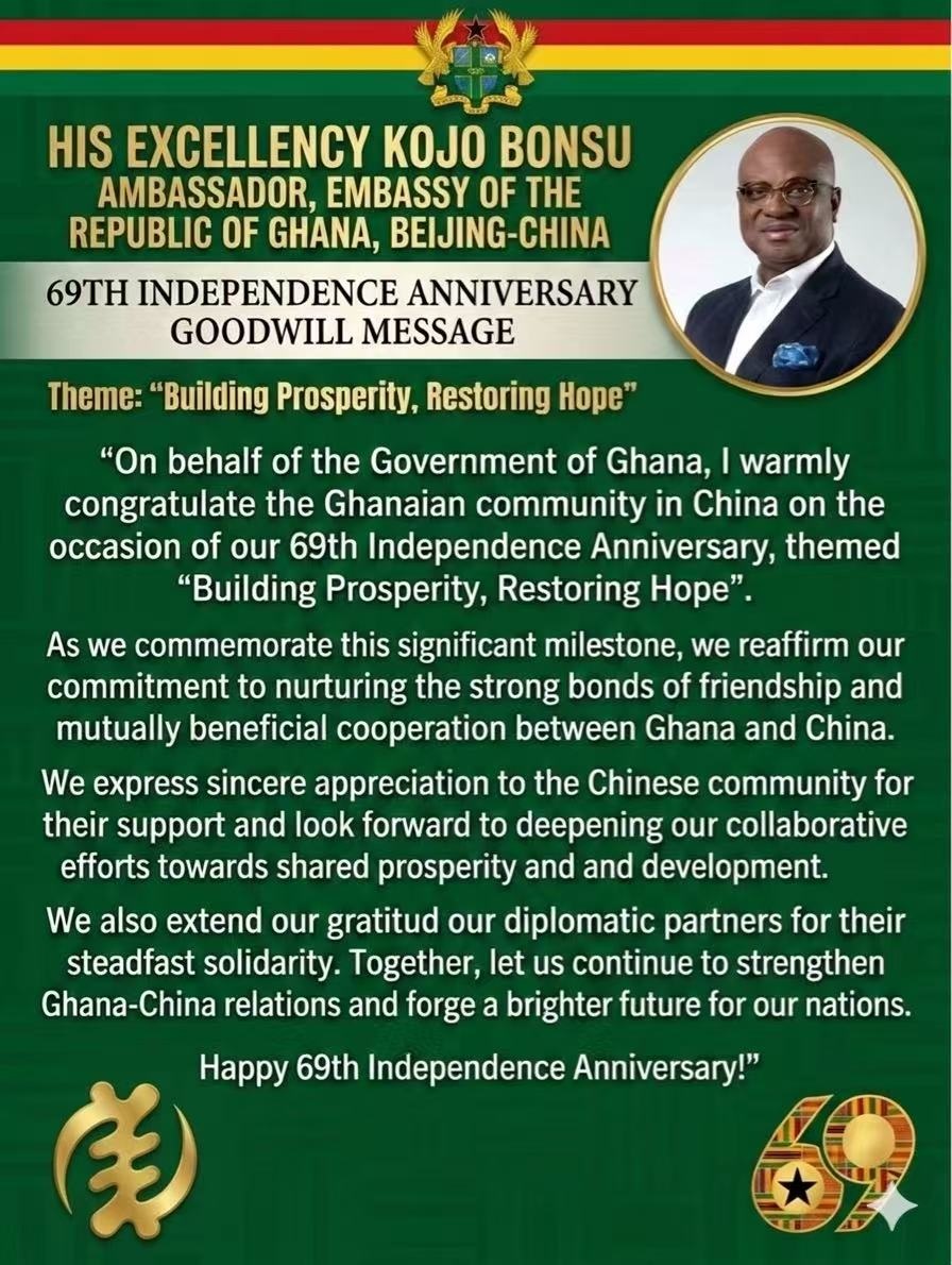 It is my sincere honour and pleasure to convey to you my appreciation for the warm welcome extended to me since my arrival in Beijing and assumption of duty as the Ambassador Extraordinaire and Plenipotentiary of the Republic of Ghana to the People's Republic of China with concurrent accreditation to the Republic of Palau, Federal Democratic Republic of Nepal, Mongolian People's Republic and the Democratic People's Republic of Korea.